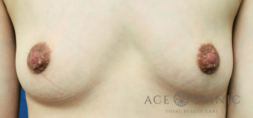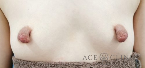 ホルモンバランスの変化や体質、物理的刺激で乳頭の形が変化したり大きくなったりすることがあります。 症例の方は、乳頭の高さを気にされていました。 乳頭の皮膚を基部で切除し、乳管部分は温存し下の部分に埋め込むような形で縫合しました。 どの角度から見てもきれいになりました。