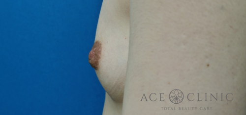 症例の方は、乳頭の高さ・大きさを気にされていました。 乳頭の皮膚を基部で切除し、乳管部分は温存し下の部分に埋め込むような形で縫合しました。 どの角度から見てもきれいになりました。