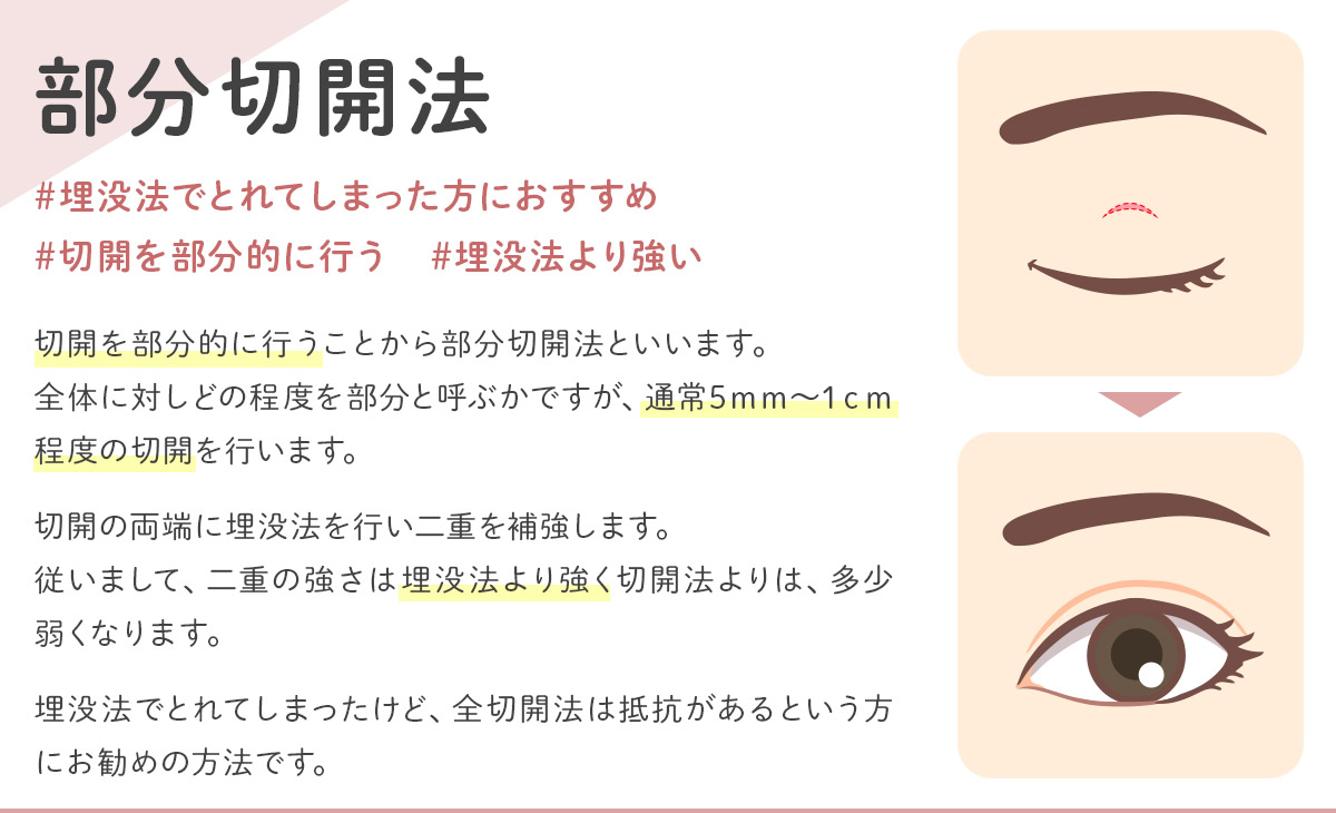 施術のリスク/副作用皮下出血、感染、しこり形成、埋没縫合糸の露出、仕上がりの左右差、まぶたの違和感、眼球の異物感等。