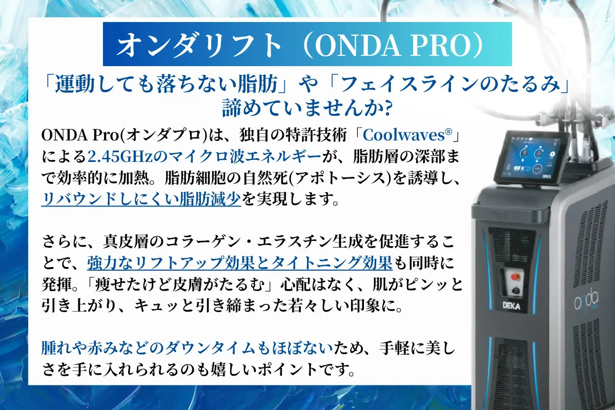 たるみの引き締めや脂肪の減少を目的とした治療には、さまざまなアプローチがあります。 従来のRF(高周波)たるみ治療機が皮膚や脂肪層を広く加熱して引き締め効果を得るのに対し、オンダプロはマイクロ波を用いて脂肪層にのみ熱エネルギーを的確に届けることができます。 さらに、採用されているCoolwaves®(クールウェーブ)技術は、一般的な高周波の約500倍ものパワーを脂肪層へ伝達しながら、皮膚表面を保護。 その結果、リフトアップ・引き締め・脂肪除去の3つの効果を一度に狙える革新的な治療が可能となっています。