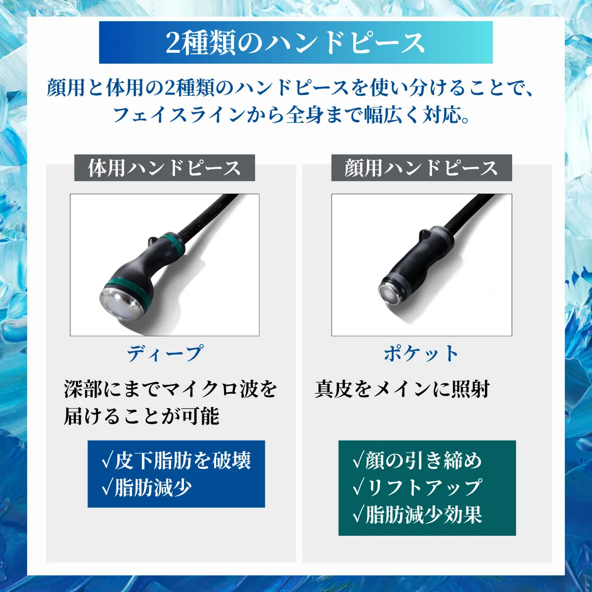 | おすすめの方 | 脂肪が多くフェイスラインがぼやけてきた方 | 皮膚のハリ・質感を改善したい方 | 骨格・SMASのゆるみが気になる方 | 皮膚の浅い層のゆるみが気になる方 |