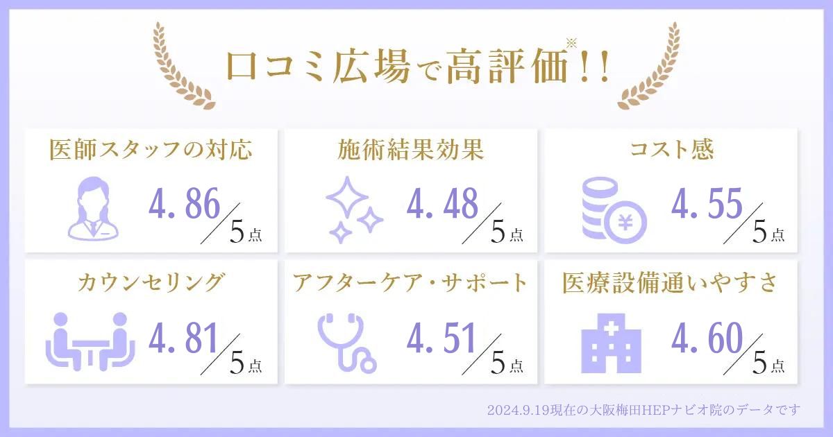 美容医療には、機器の性能や使用方法など、さまざまな要素が関係します。エースクリニック大阪梅田HEPナビオ院は、それら全ての要素を高いレベルで管理し、質の高い治療をご提供しています。リピーターが多いのは、その証しとも言えるでしょう。